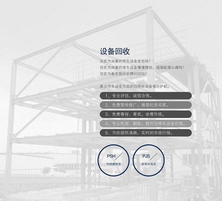 还在为闲置的停车设备发愁吗?还在为闲置的停车设备慢慢锈蚀,逐渐贬值心痛吗?还在为是否低价处理纠结吗?莱贝停车设备为您的旧停车设备保价护航。莱贝通过持续改进,不断设计并优化停车场方案,为客户提供全方位、专业化、多元化的立体停车场投资经营以及技术支持服务,致力于成为国内更具创新力的立体停车场投资经营提供商。
